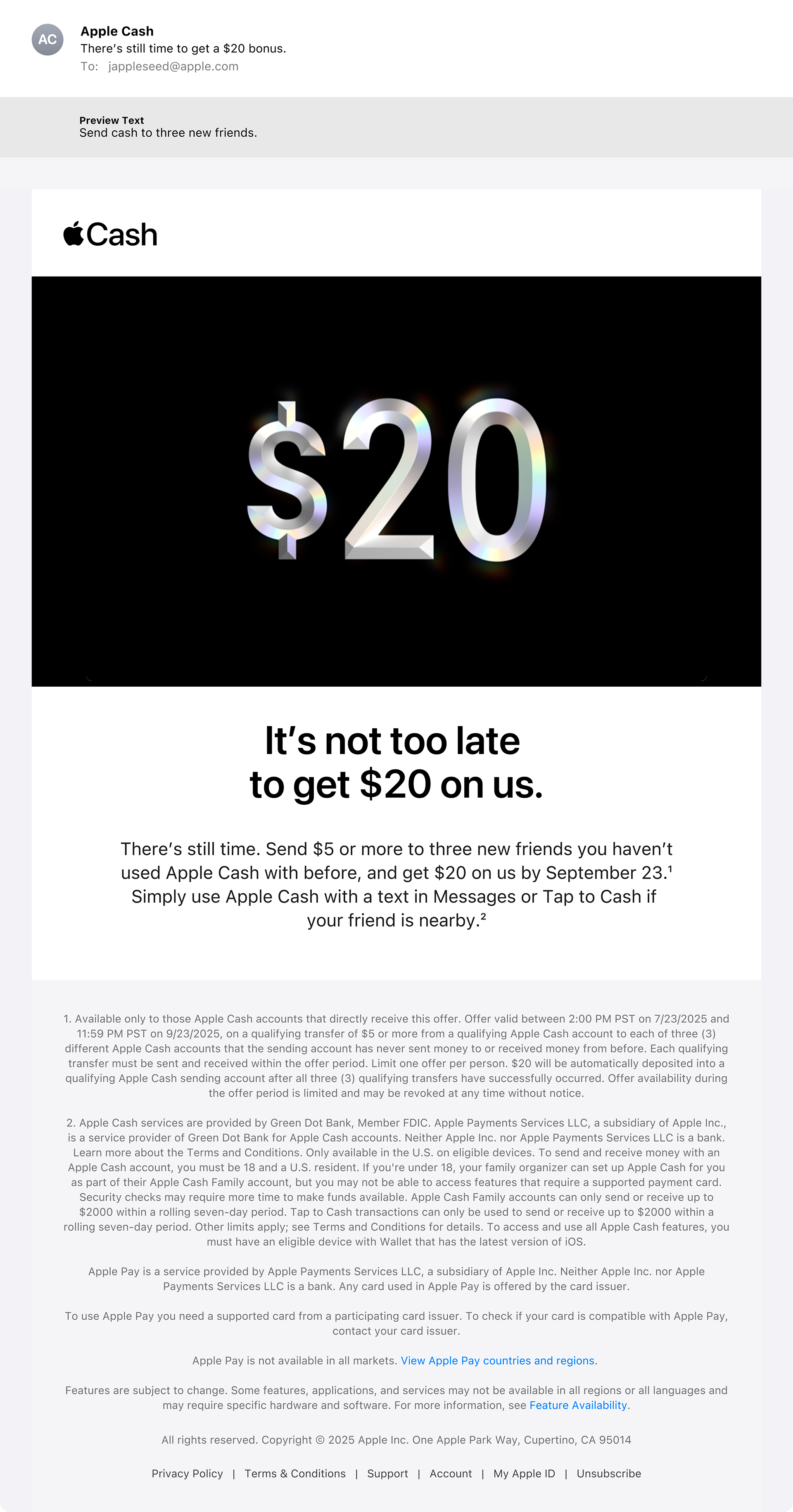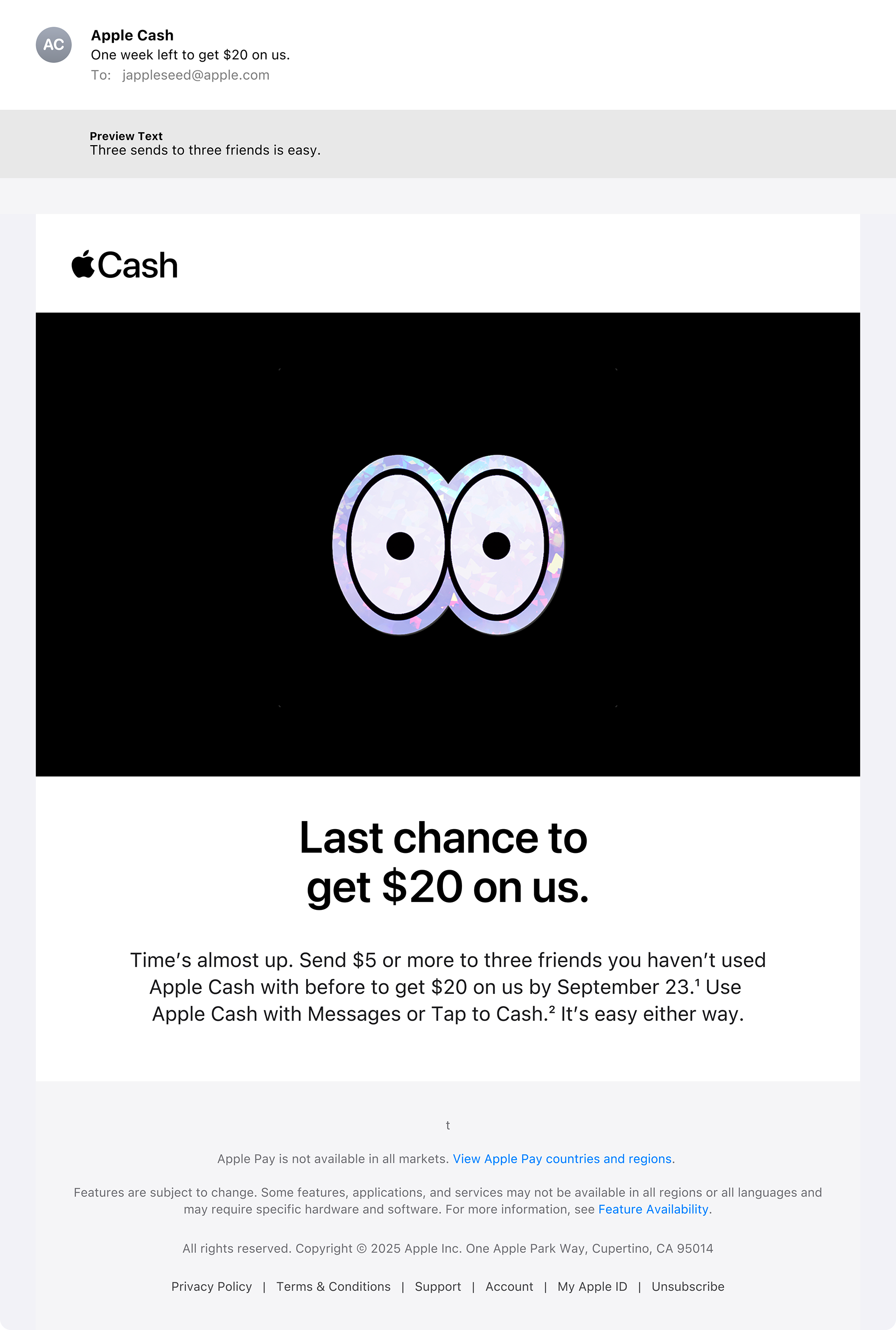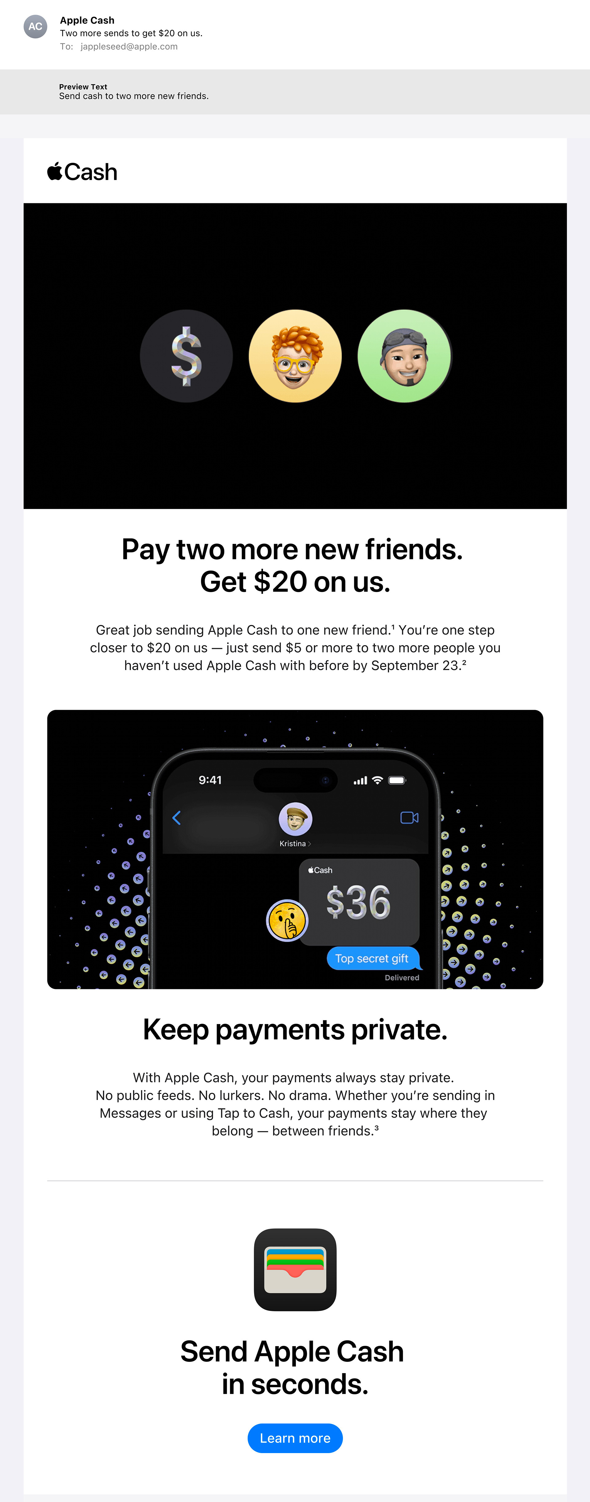 Apple Cash wanted to get more people into the habit of sharing cash on their platform. This email-based promotion rewarded those who shared with friends, even more cash.